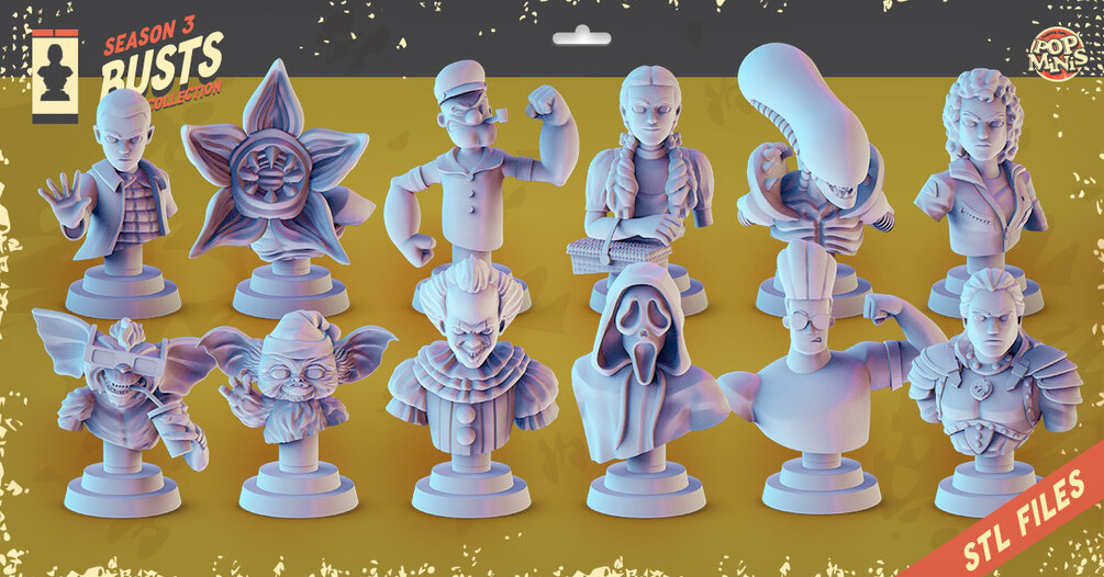 Pop culture character busts as 12 STL files, ready for 3D printing!